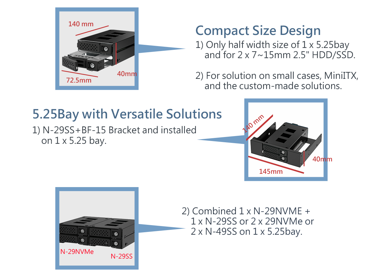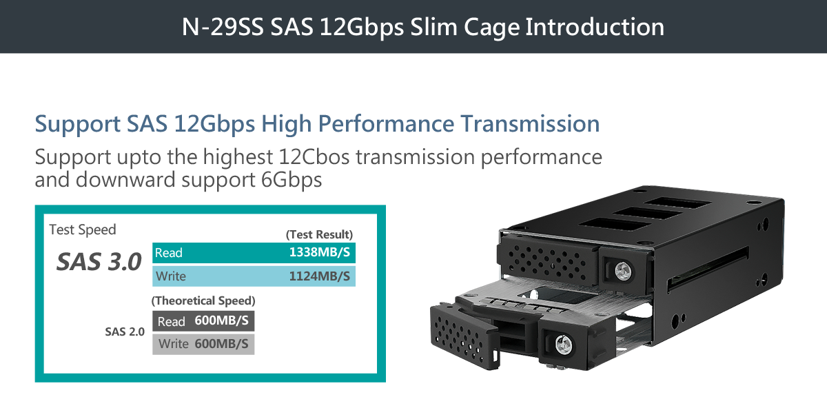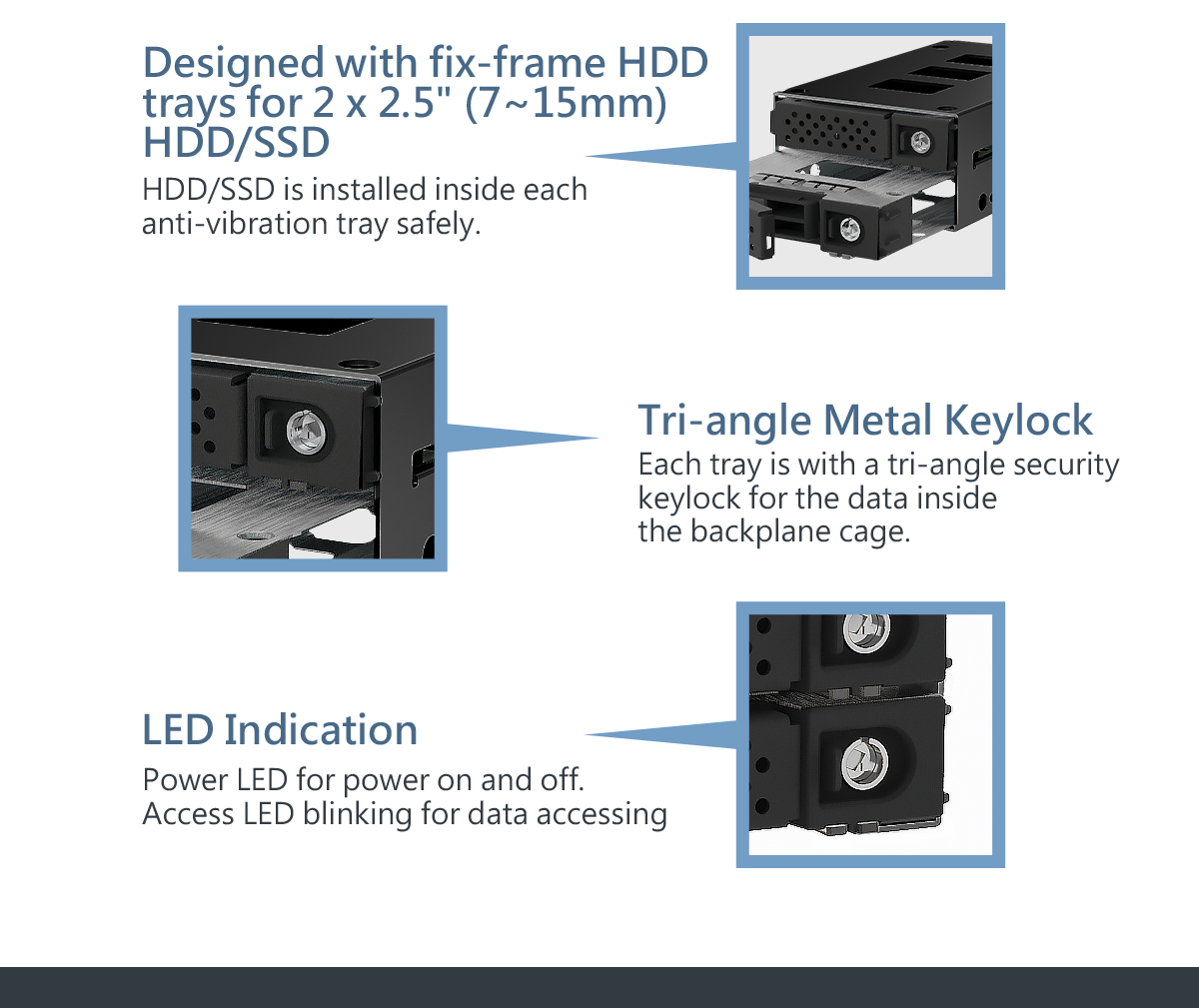 2 X 2.5” SATA I, II, III & SASI, II, III (12Gbps) HDD/SSD (* Height Up To 15mm)