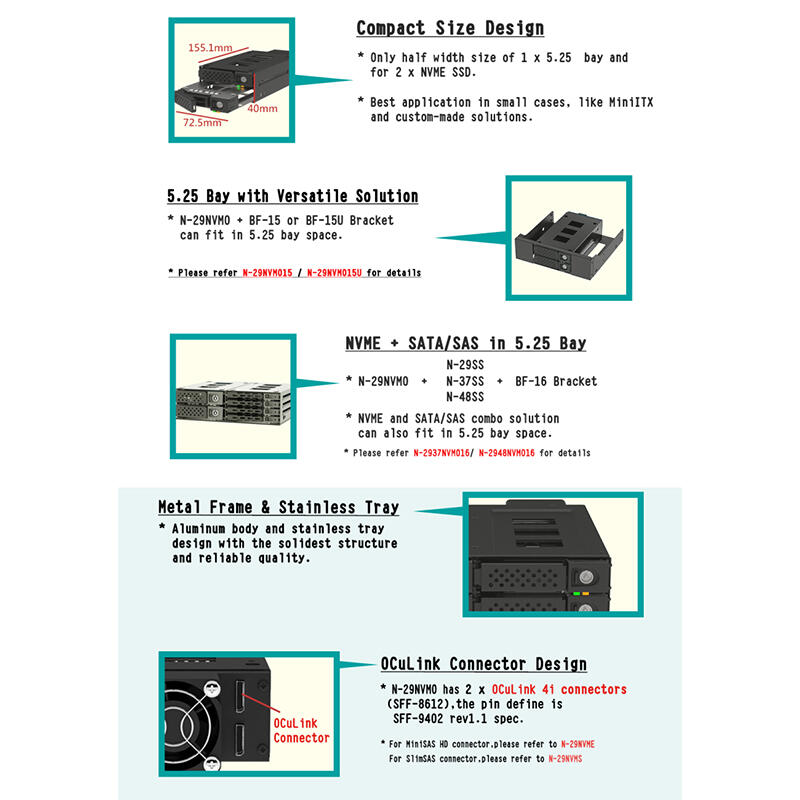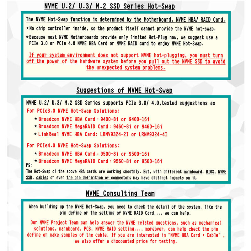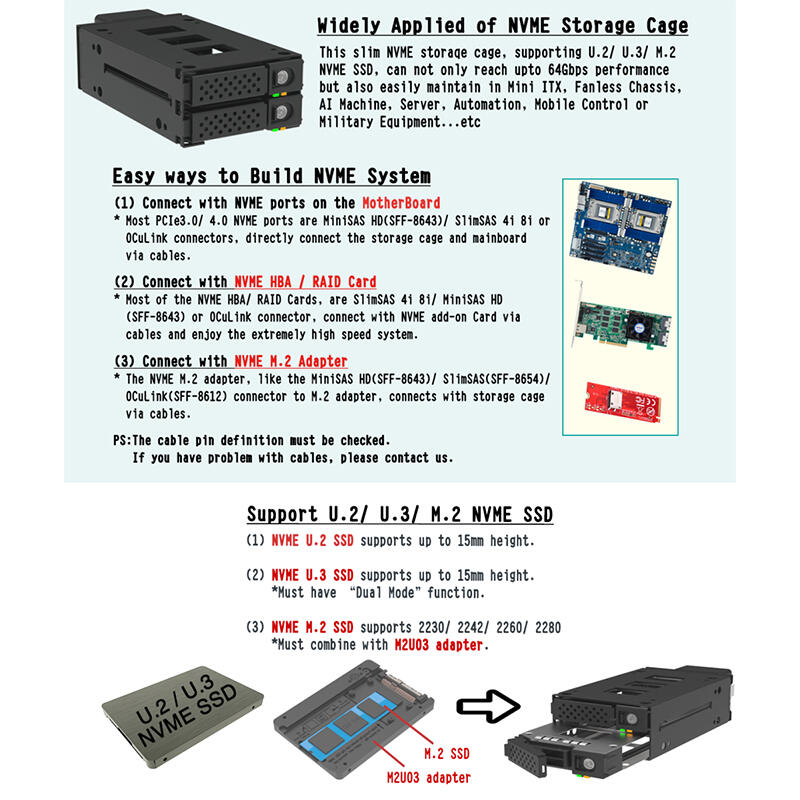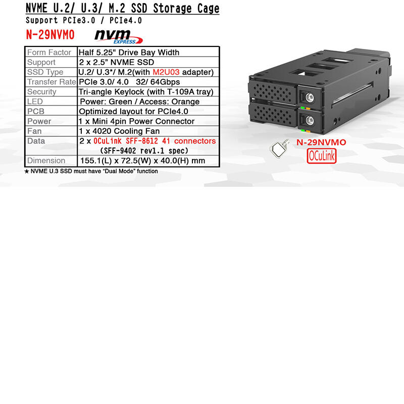 U.2/ U.3(With Dual Mode) M.2(With M2U03 Adapter), 2230/ 2242/ 2260/ 2280 |