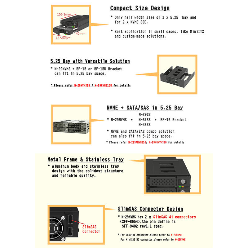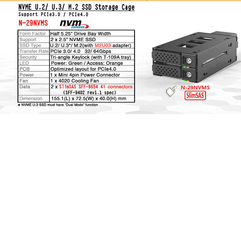 U.2/ U.3(With Dual Mode) M.2(With M2U03 Adapter), 2230/ 2242/ 2260/ 2280 |