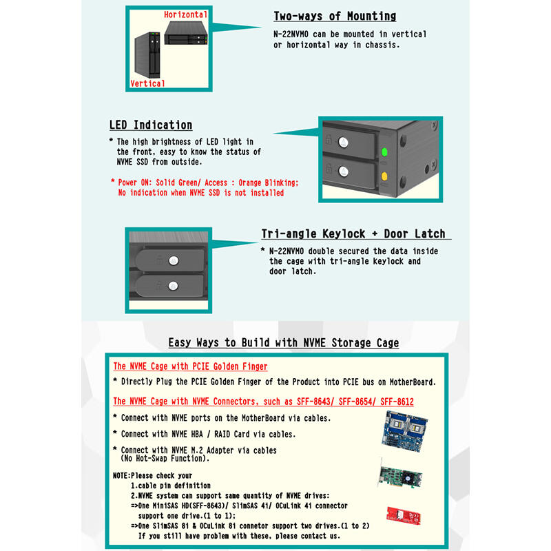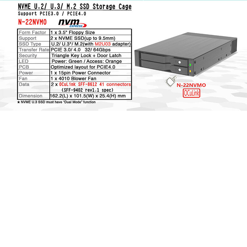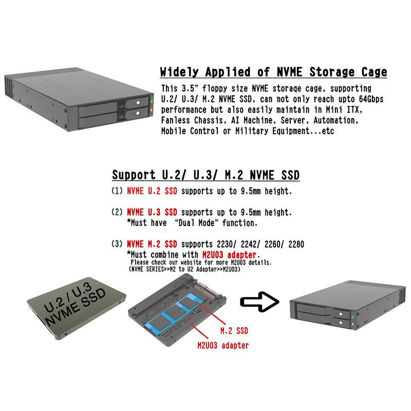U.2/ U.3(With Dual Mode) M.2(With M2U03 Adapter), 2230/ 2242/ 2260/ 2280 |