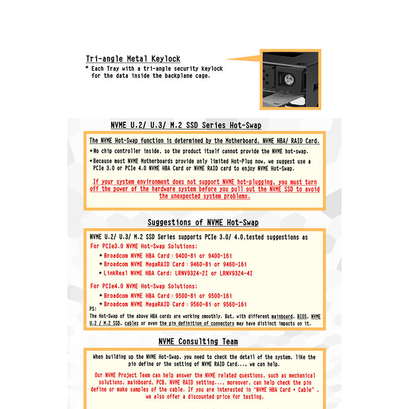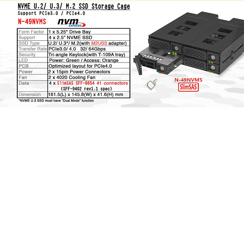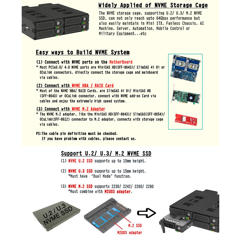 U.2/ U.3(With Dual Mode) M.2(With M2U03 Adapter), 2230/ 2242/ 2260/ 2280 |