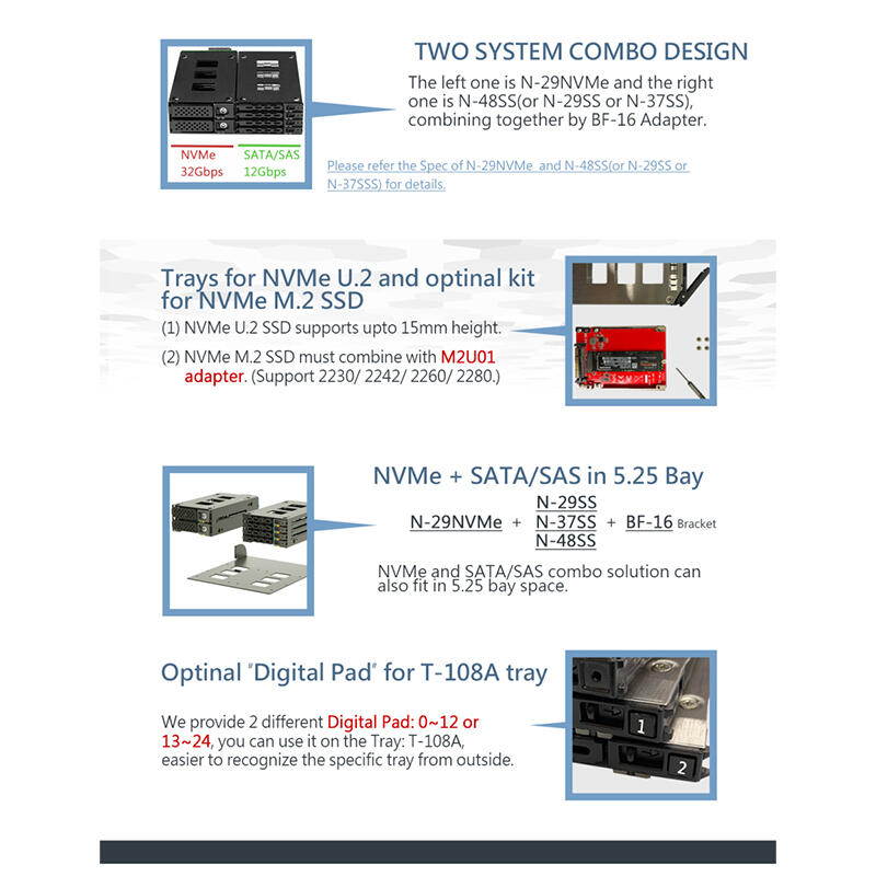 2 X 2.5” U.2/ U.3*/ M.2(With M2U03 Adapter) Up To 15mm (PCIe3.0/4.0 X4 32/64Gbps) 4 X 2.5” SATA I, II, III & SAS I, II, III (12Gbps) HDD/SSD(* Up To 7mm) |