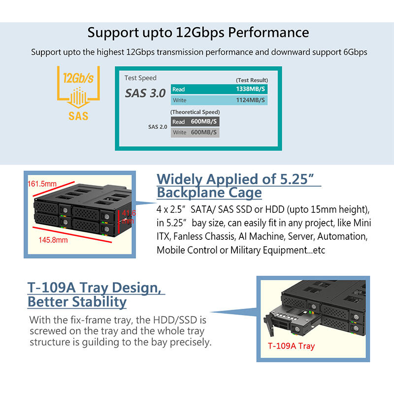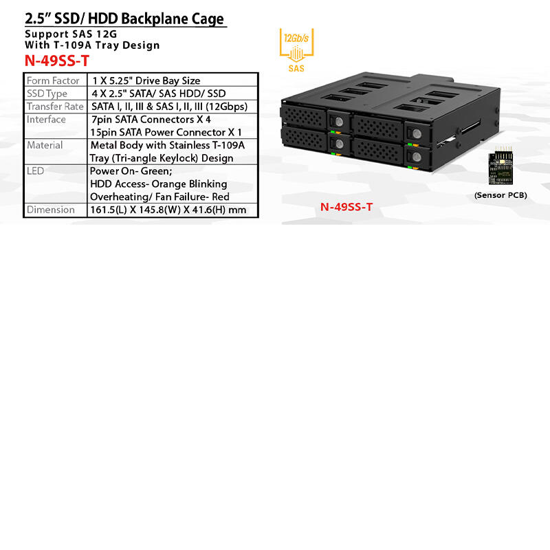 4 X 2.5” SATA I, II, III & SAS I, II, III (12Gbps) HDD/SSD (* Height Up To 15mm) |