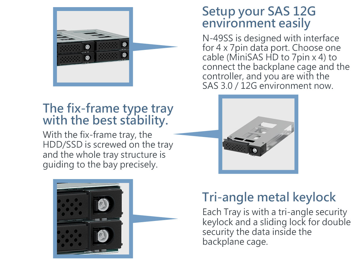 4 X 2.5” SATA I, II, III & SAS I, II, III (12Gbps) HDD/SSD (* Height Up To 15mm)