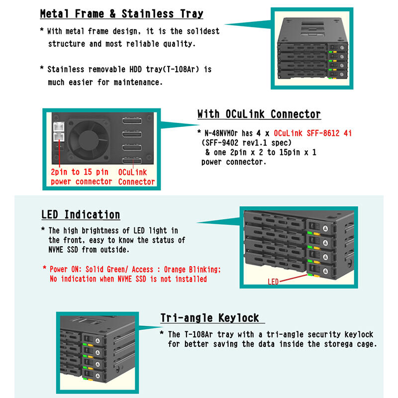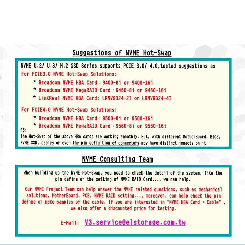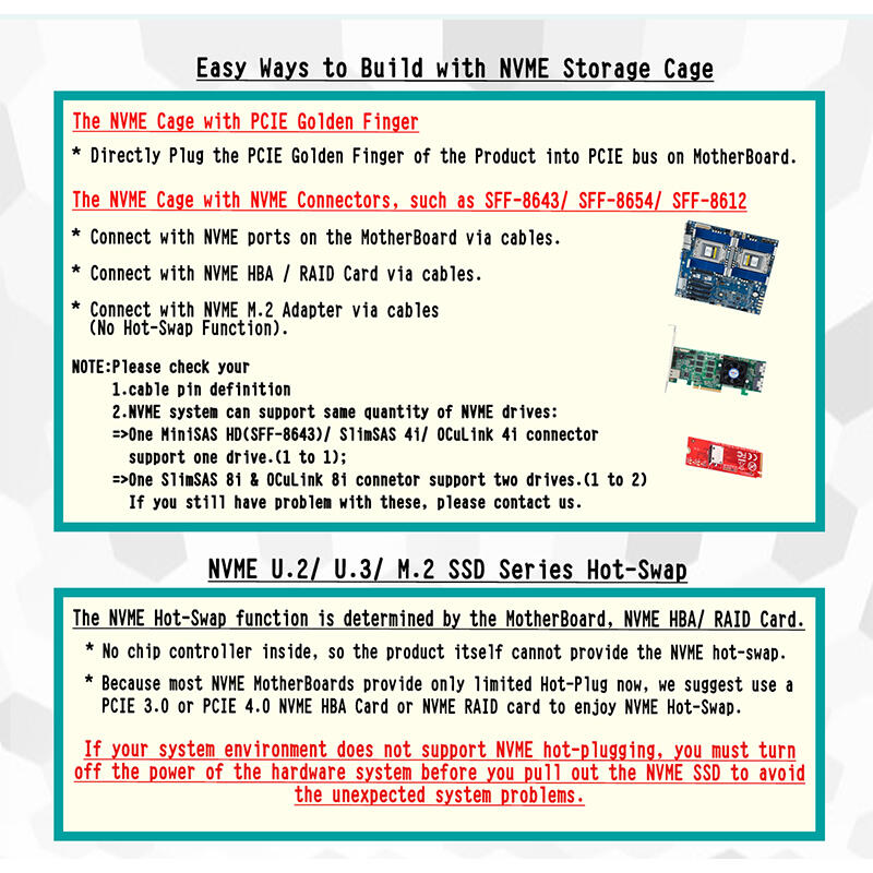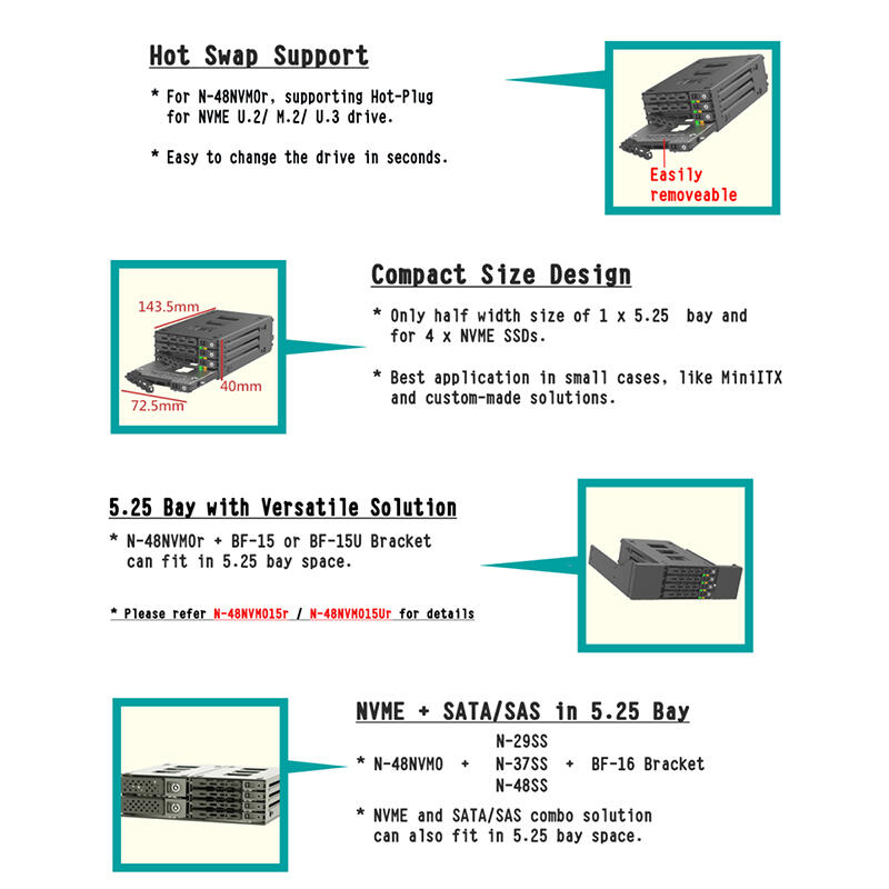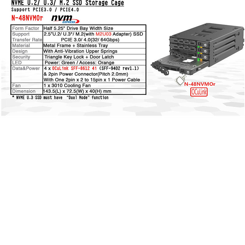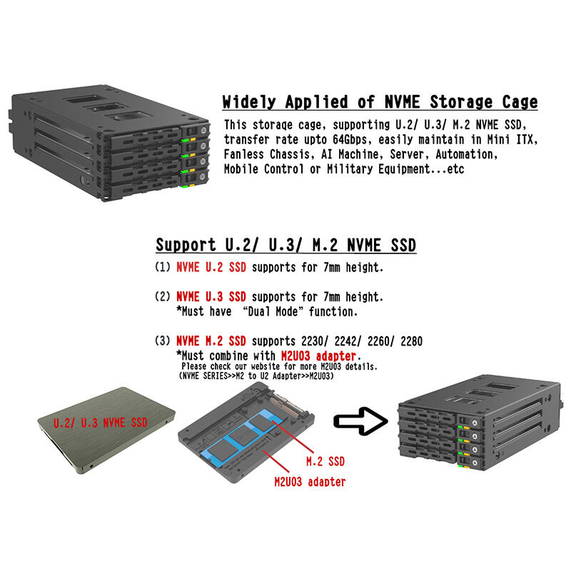 U.2/ U.3(With Dual Mode) M.2(With M2U03 Adapter), 2230/ 2242/ 2260/ 2280 |