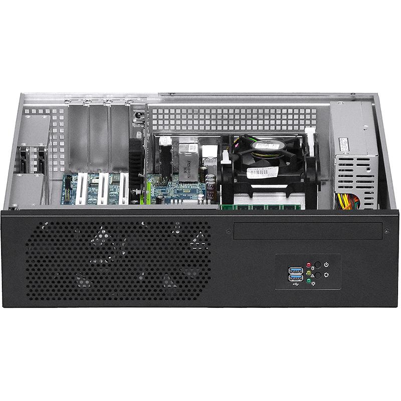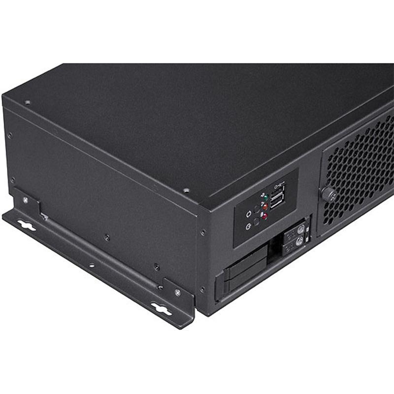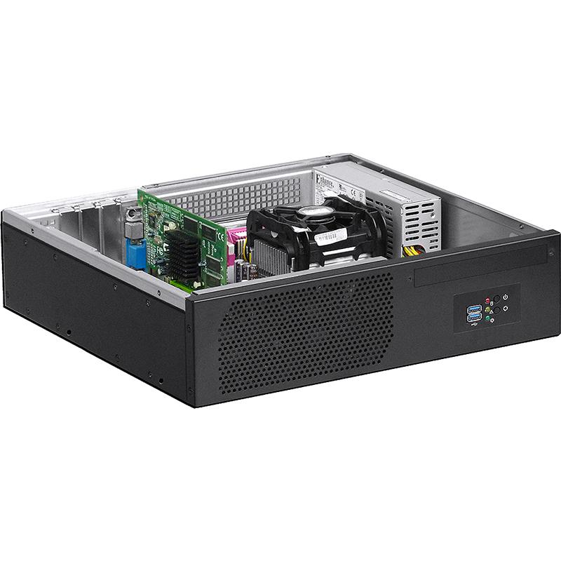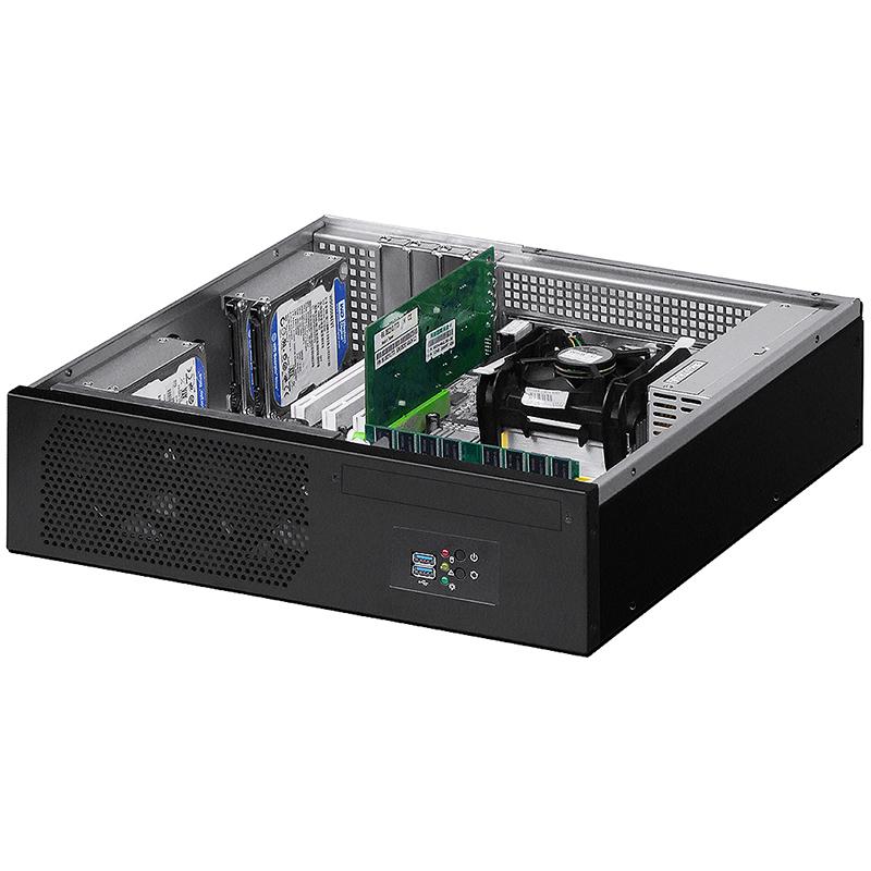 The most particular feature of this product is designed as multifunctional applications, the Desktop mode is suitable for enterprise server application, the MiniTower mode also applies to workstation computing applications, the Wallmount mode for industrial controls and NVR surveillance systems (wallmount bracket is option), this chassis can support maximum one slimline DVDRW and four 2.5" SSD/HDD device. Rugged 1.0mm thickness SGCC sheet metal constructed. Four low profile expansion-cards allowed.