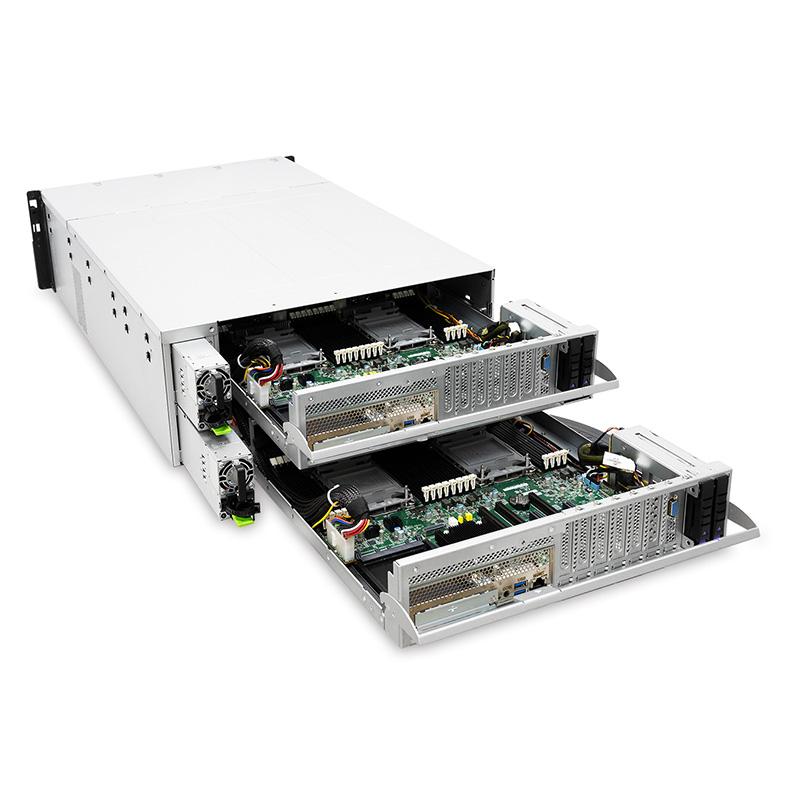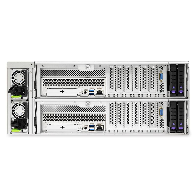 4U 24-bay high availability storage server, 24x 12G SATA/SAS hot-swap 3.5/2.5" bay, 2x canister, 1600W 1+1 Platinum redundant power supply, 8x 6038 fan, 36" slide rail, w/o bezel Per canister node: Tucana motherboard, Intel Lewisburg, DDR4 RDIMM x16, Intel PCH C621A, 1 x GbE dedicate IPMI, 3x PCIe x16 Gen.4 (HHHL), 2x PCIe x8 Gen.4 (HHHL), 1x OCP 3.0 x16 Gen.4, , 2x M.2 PCIe/SATA, EATX, 2x CPU heatsink, 2x 2.5" hot-swap PCIe Gen.4 NVMe |
